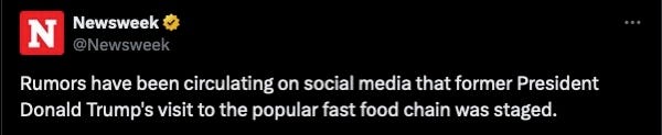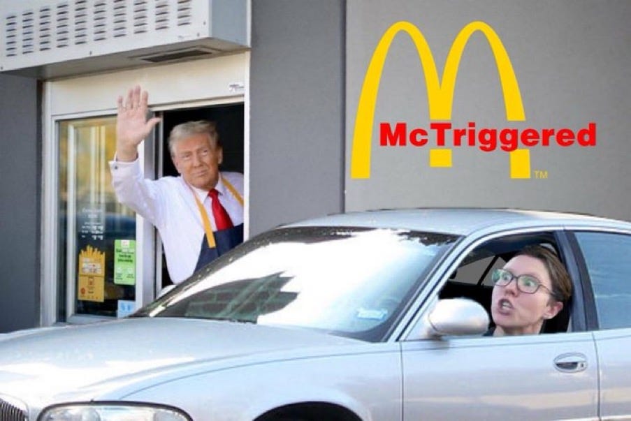 For whatever reason, both the left and the increasingly absurd silk-stocking fops in what counts as the Never Trump “intelligentsia,” are very upset about the former President’s campaign sojourn at a Pennsylvania McDonald’s fryer and drive-thru window. The Atlantic’s David Frum, for instance, was very keen to have us know that Donald Trump hadn’t actually quit being a billionaire real estate mogul and Presidential candidate in order to sign on full time as a Mickey D’s burgermeister. While Jonah Goldberg of The Dispatch — who days ago joined the Harris campaign in questioning whether Trump had the energy and stamina to complete the campaign — pivoted to questioning why anyone is getting excited that a tired old man who has neither the energy nor the stamina to complete his presidential campaign, took time out from being exhausted and ready to give up his electoral ambitions to cook, bag, and serve fries to McDonalds’ customers.